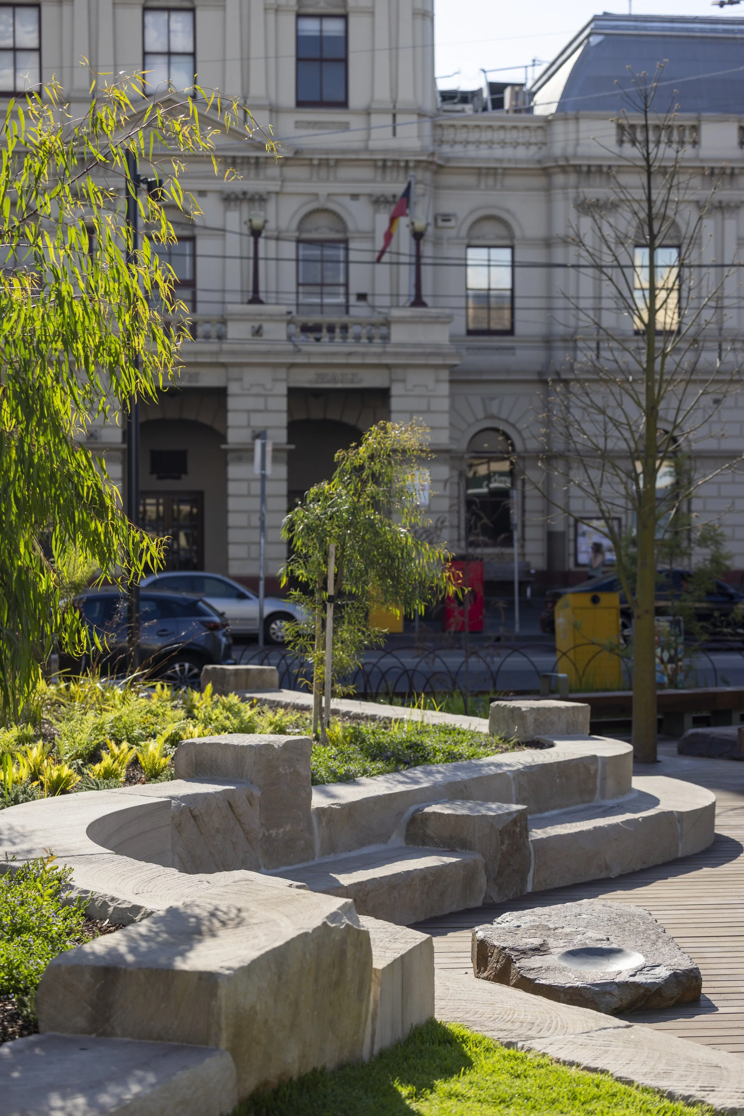 Working in partnership with Merri-bek City Council, GLAS led the design team in creating a new pocket park on Sydney Road in the heart of Brunswick. Designed in response to extensive community consultation, the park offers a green oasis with serene spaces to sit and connect with nature. Drawing inspiration from the Wurundjeri Woi Wurrung people’s connection to Merri Creek and the meaning of Merri-bek—“rocky country"—the design incorporates native materials and planting to honour this cultural heritage.
